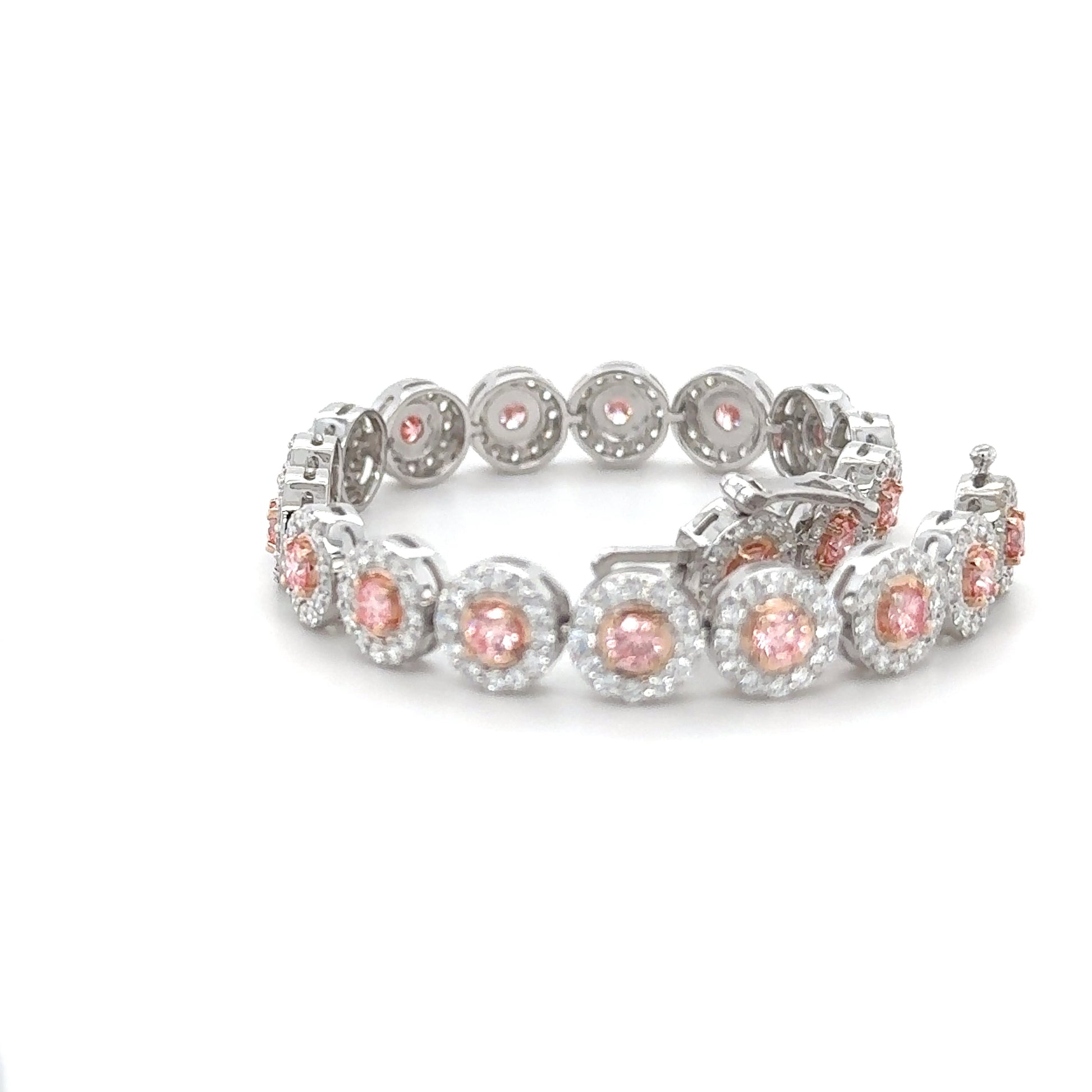 Halo Diamond Bracelet with Color Pink Diamond Center crafted in 14k with a total carat weight of 3.5. Features diamonds of E-F color and VVS-VS clarity, set in a mounting. A luxurious addition to any jewelry collection.